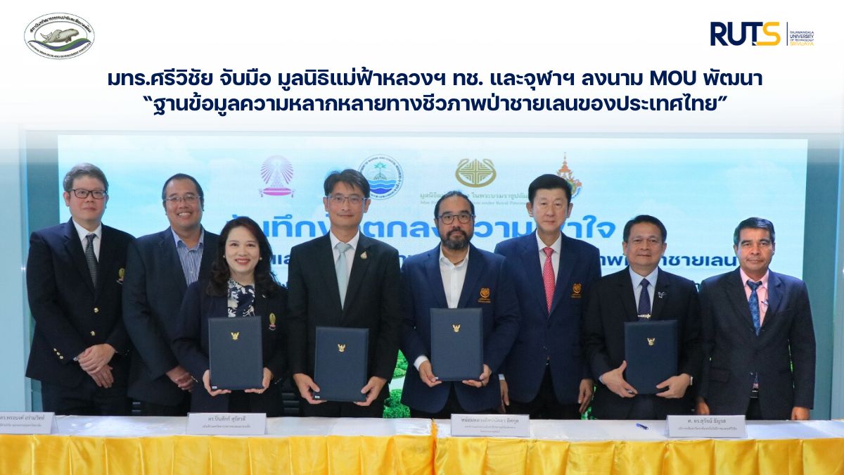 วันที่ 16 ตุลาคม 2568 มหาวิทยาลัยเทคโนโลยีราชมงคลศรีวิชัย (มทร.ศรีวิชัย) ร่วมกับมูลนิธิแม่ฟ้าหลวง ในพระบรมราชูปถัมภ์ กรมทรัพยากรทางทะเลและชายฝั่ง (ทช.) และจุฬาลงกรณ์มหาวิทยาลัย ลงนามบันทึกข้อตกลงความเข้าใจ (MOU) “โครงการสำรวจและประเมินความหลากหลายทางชีวภาพในป่าชายเลน เพื่อจัดทำฐานข้อมูลของประเทศไทย และต่อยอดสู่กลไกทางการเงินด้านการเปลี่ยนแปลงสภาพภูมิอากาศ”